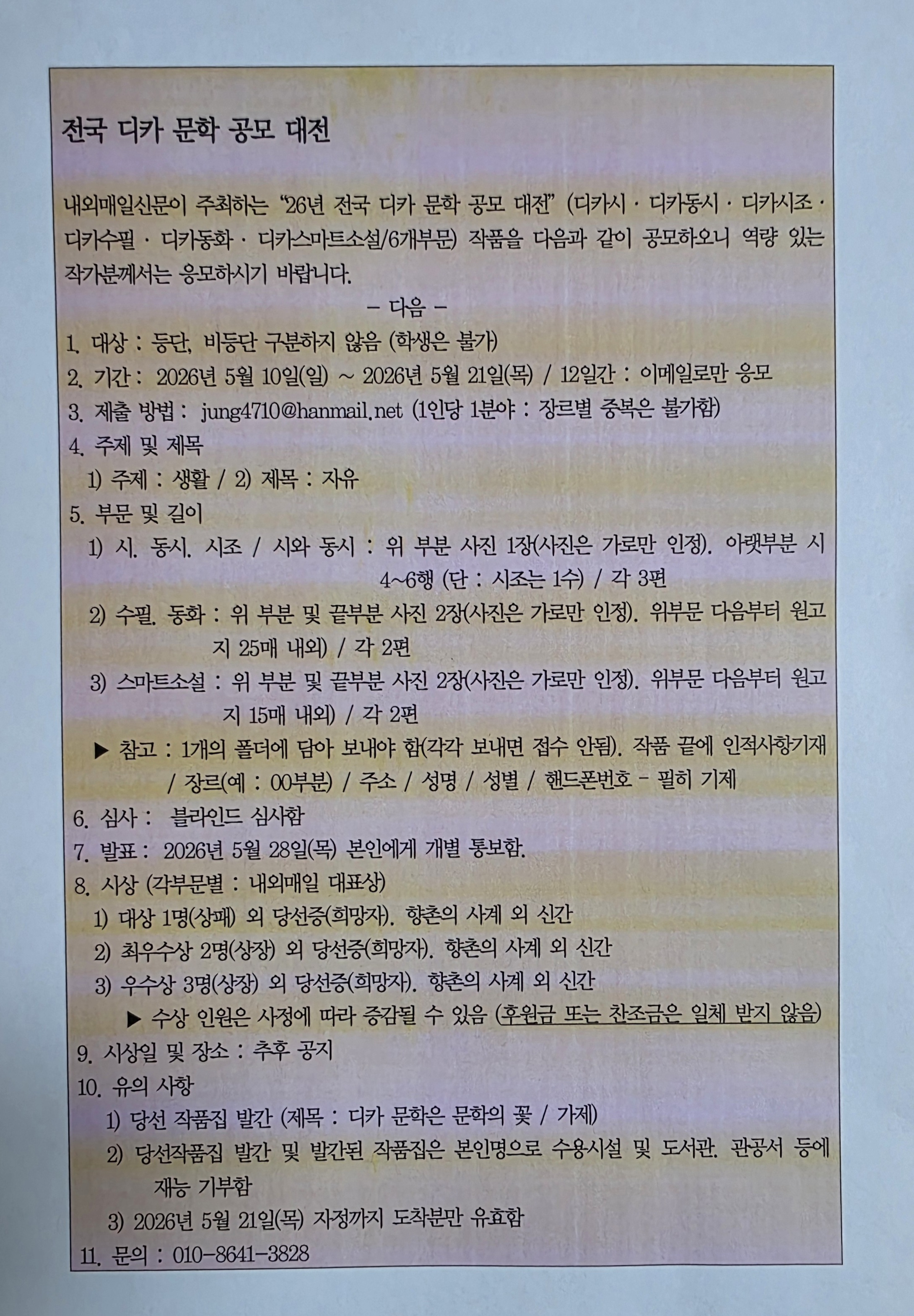 •    - 내외매일신문이 주최하는“26년 전국 디카 문학 공모 대전”