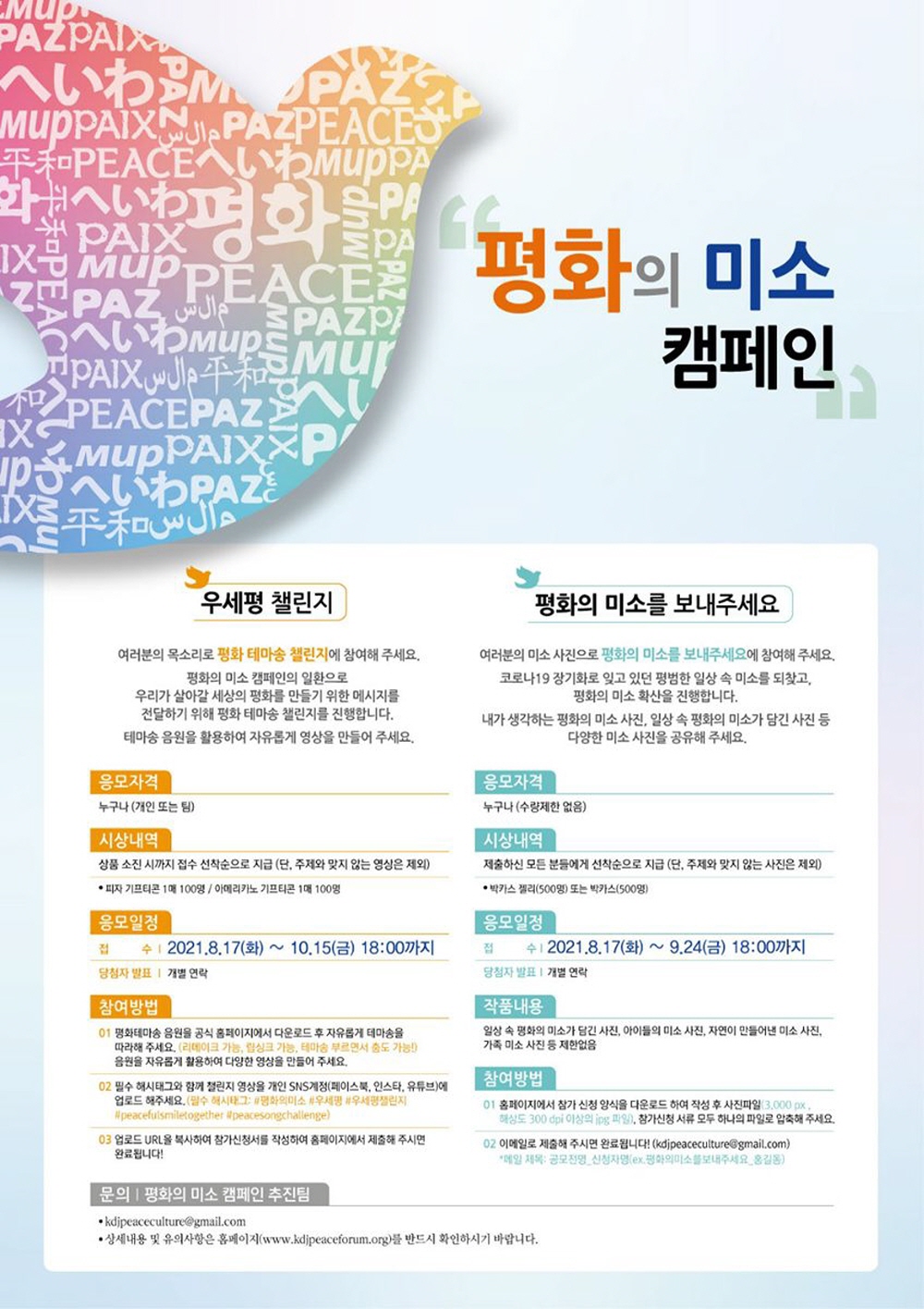 ① 이메일 접수(kdjpeaceculture@gmail.com) *공모전명_신청자명(ex.평화의미소를보내주세요_홍길동)