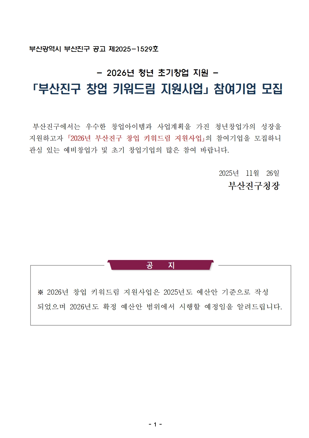 창업 [부산] 진구 2026년 청년 초기창업 지원 창업 키워드림 지원사업 참여기업 모집 공고