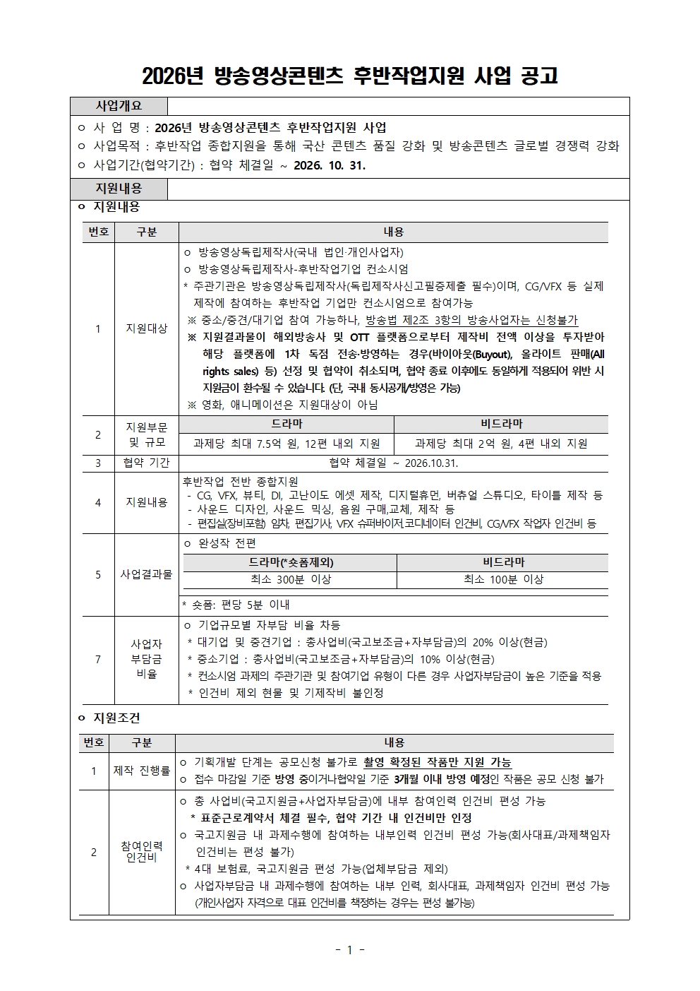 2026년 방송영상콘텐츠 후반작업지원 사업 공고