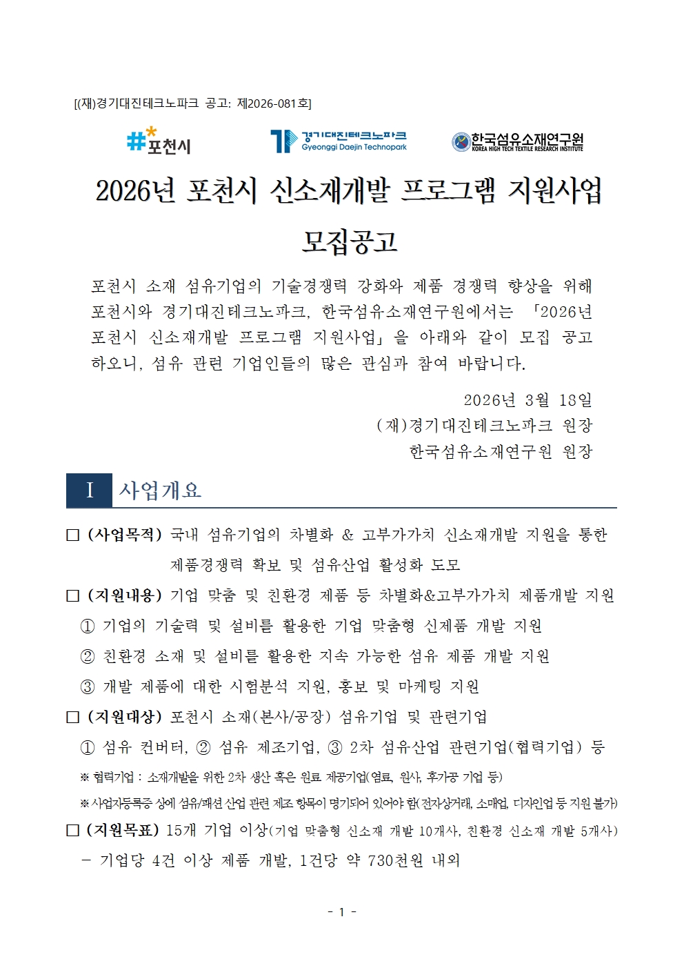 [경기] 포천시 2026년 신소재개발 프로그램 지원사업 모집 공고