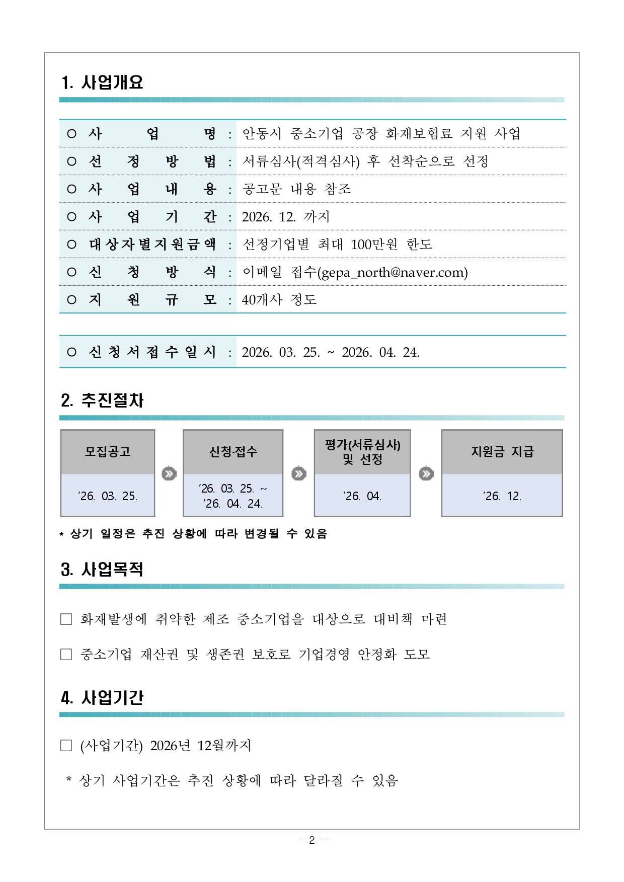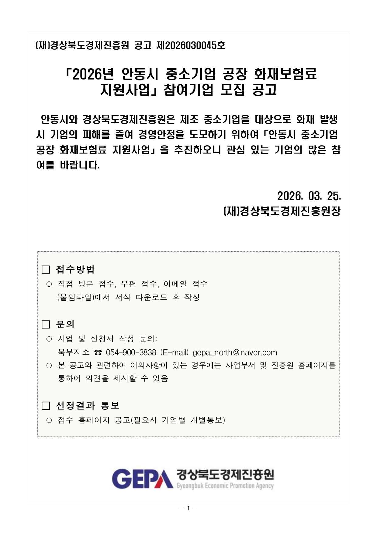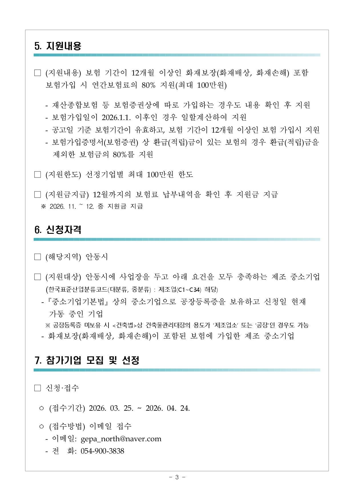 [경북] 안동시 2026년 중소기업 공장 화재보험료 지원 참여기업 모집 공고
