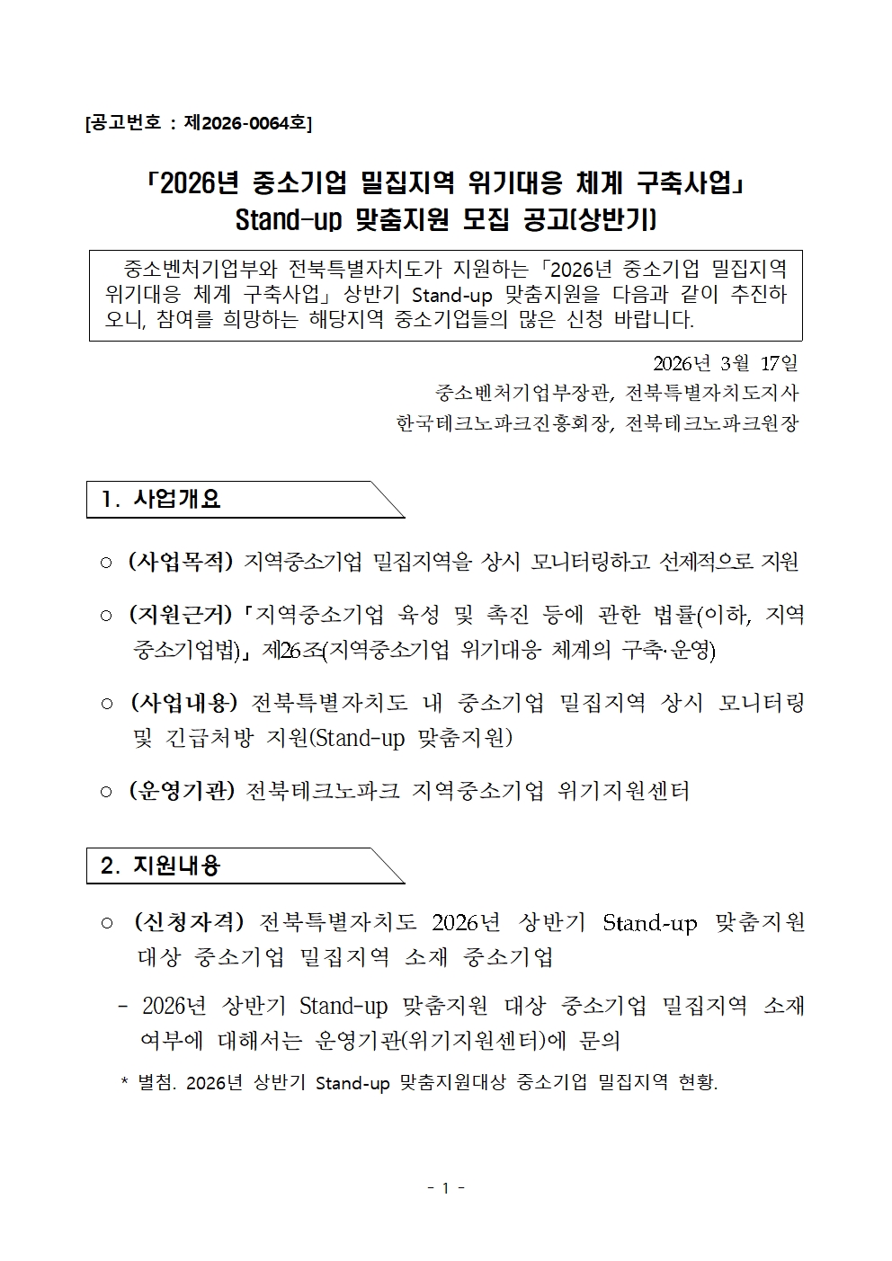 경영 [전북] 2026년 상반기 중소기업 밀집지역 위기대응 체계 구축사업 Stand-up 맞춤지원 모집 공고