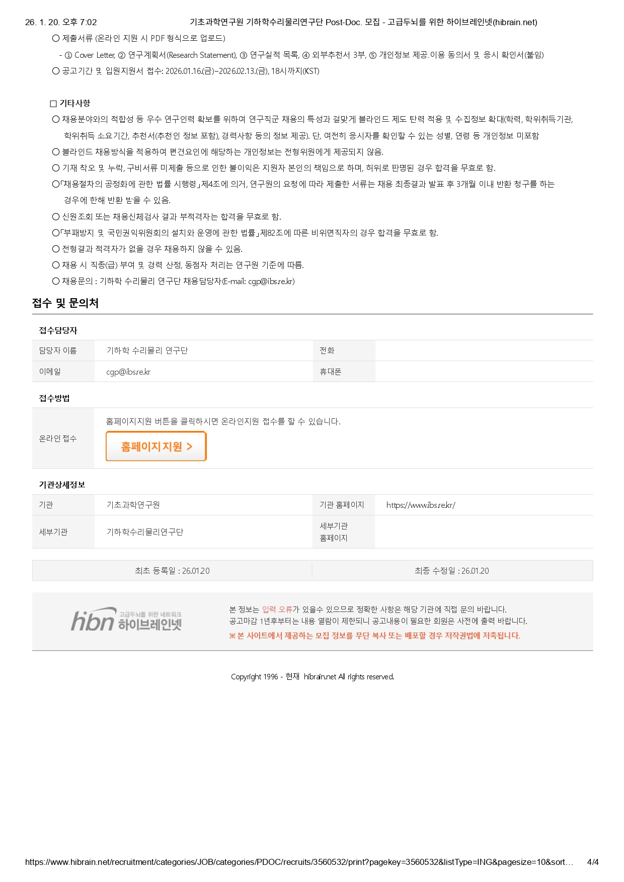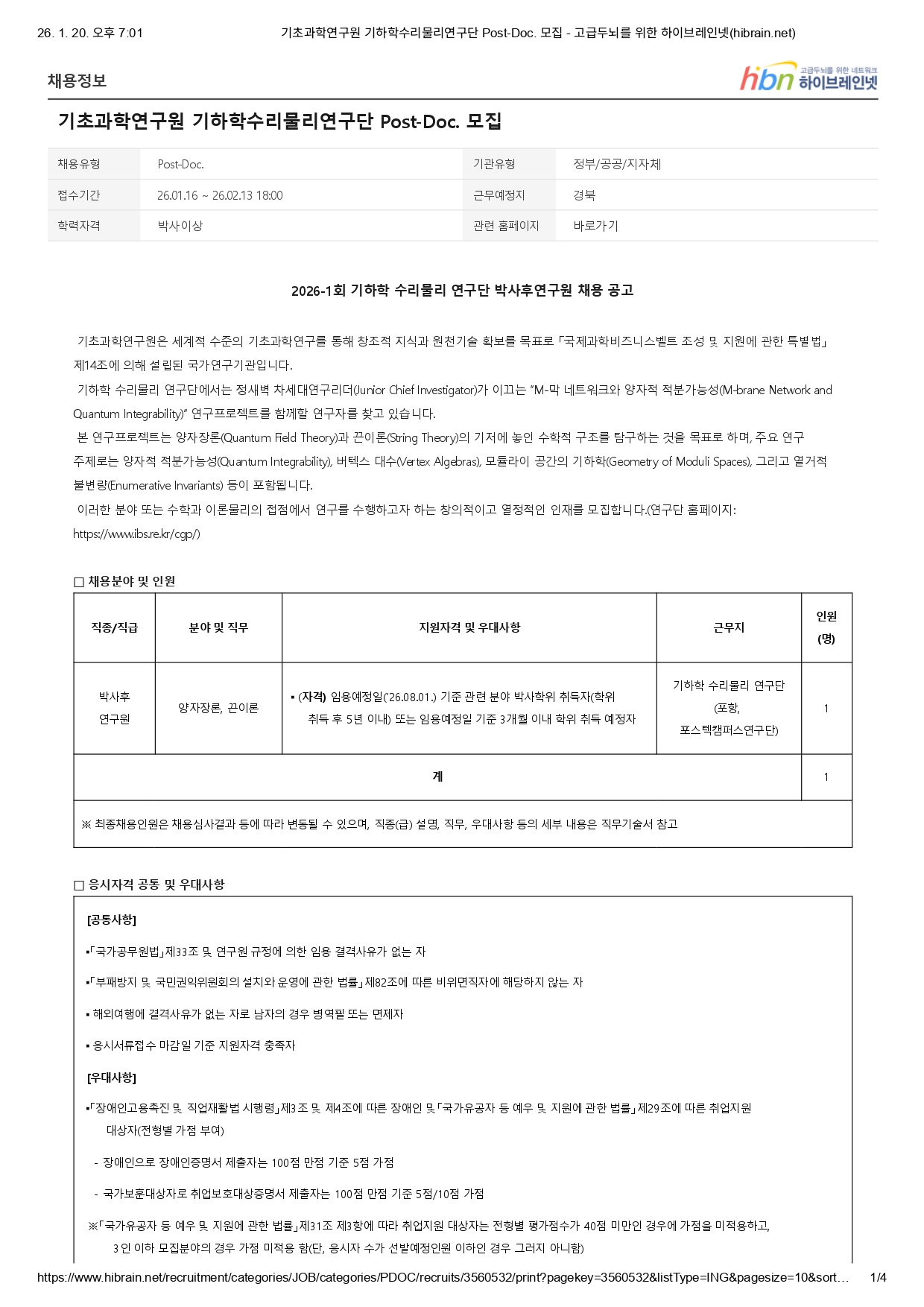 기초과학연구원 기하학수리물리연구단 Post-Doc. 모집