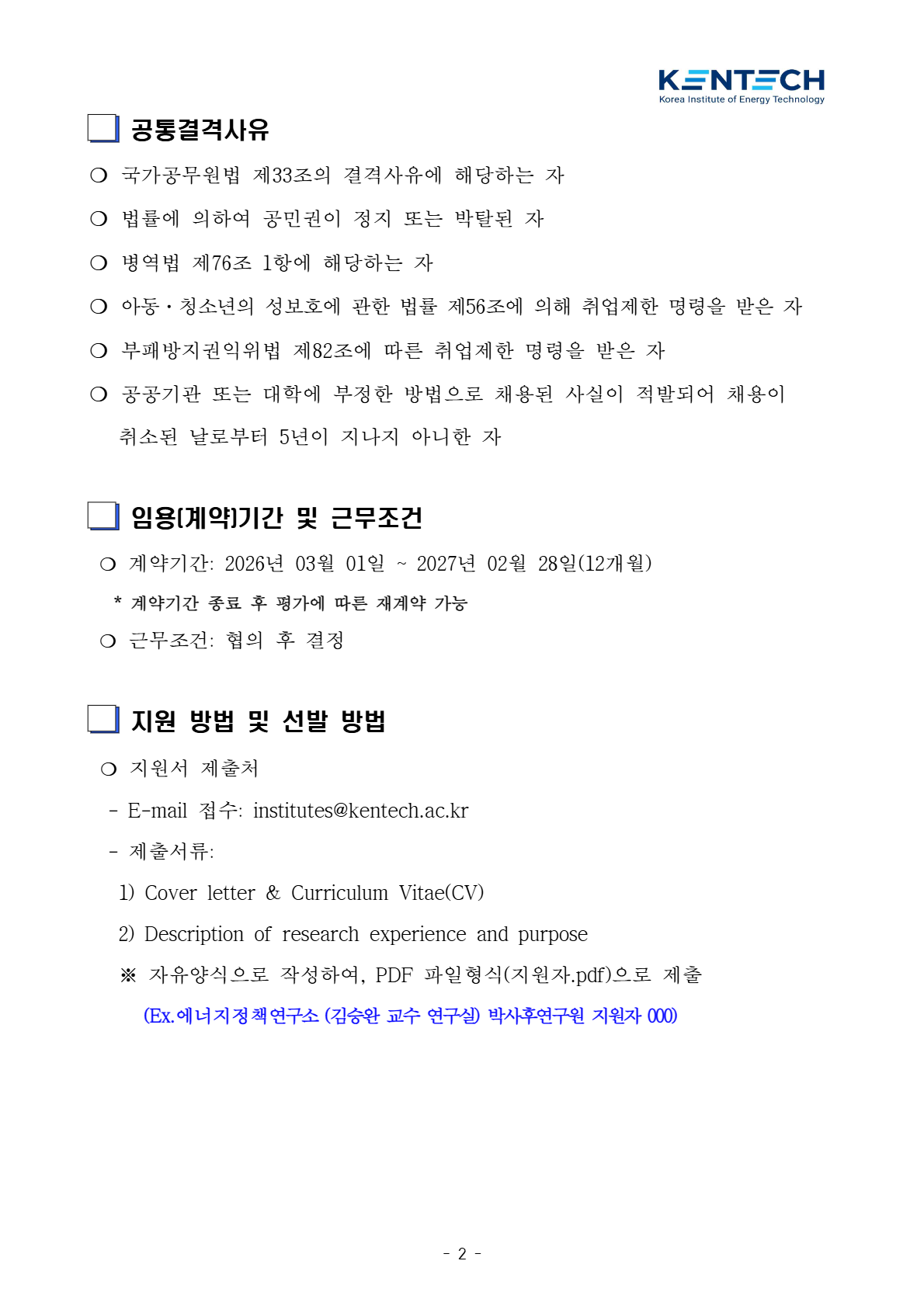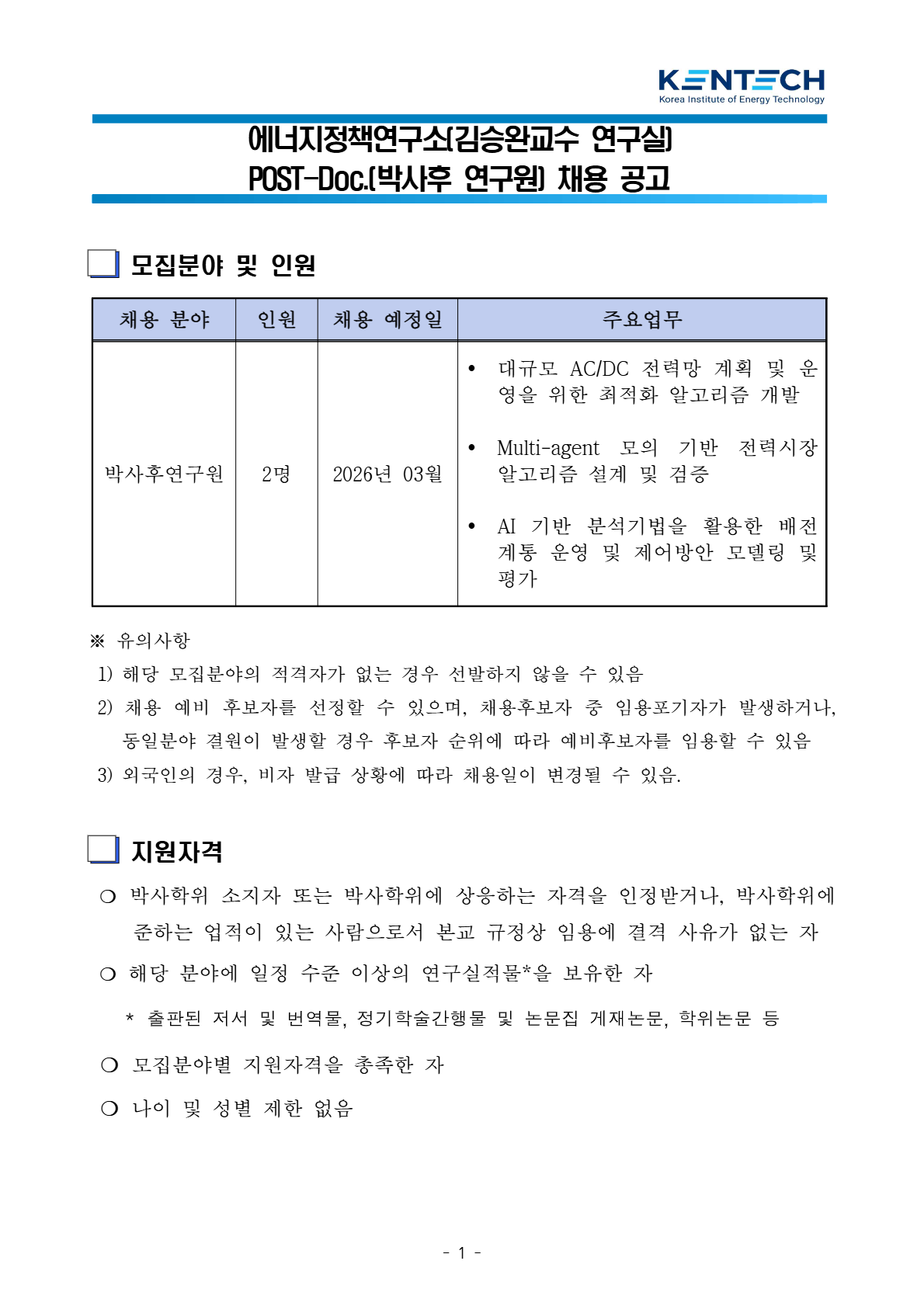 한국에너지공과대학교 에너지정책연구소 Post-Doc. 모집