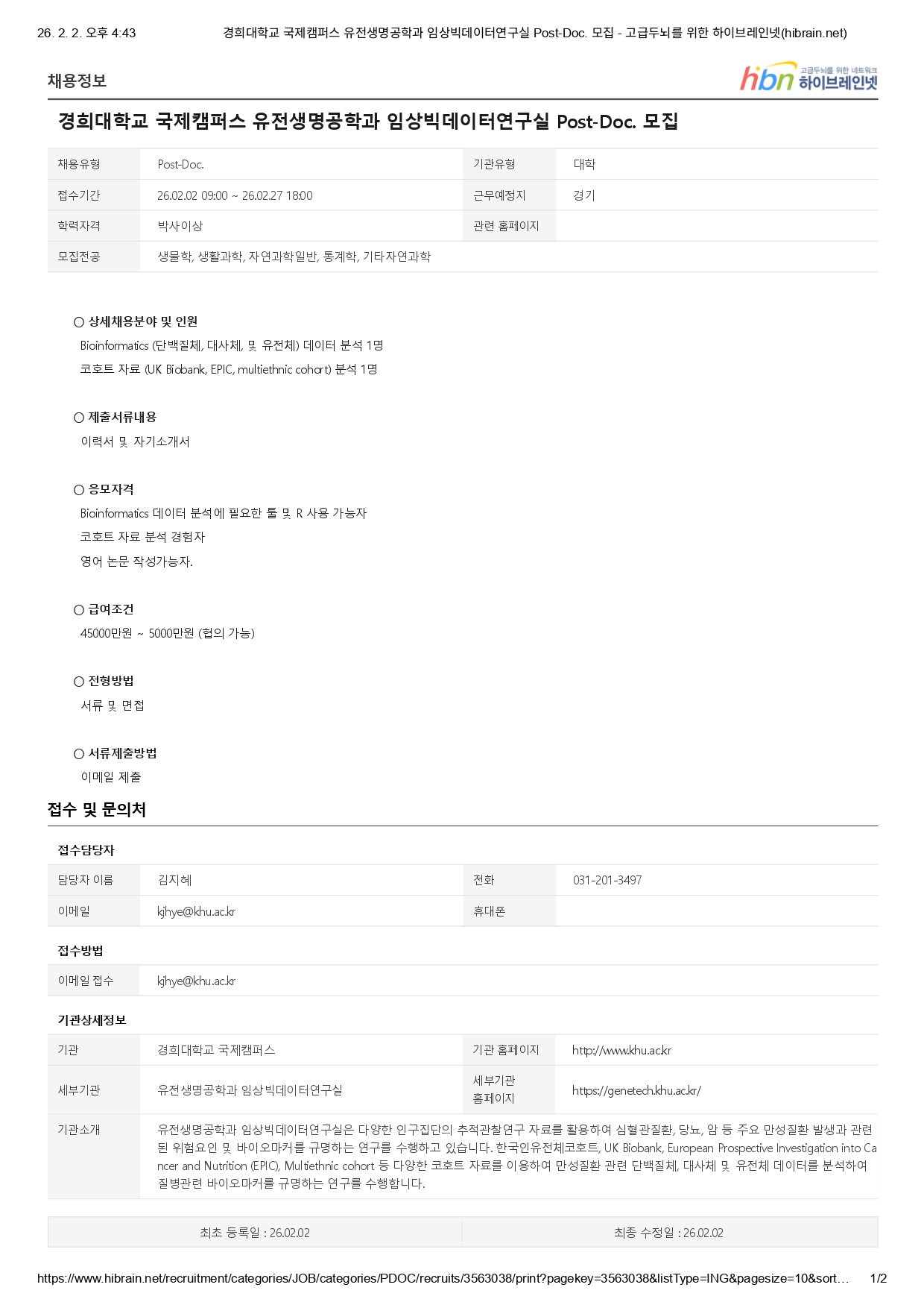경희대학교 국제캠퍼스 유전생명공학과 임상빅데이터연구실 Post-Doc. 모집