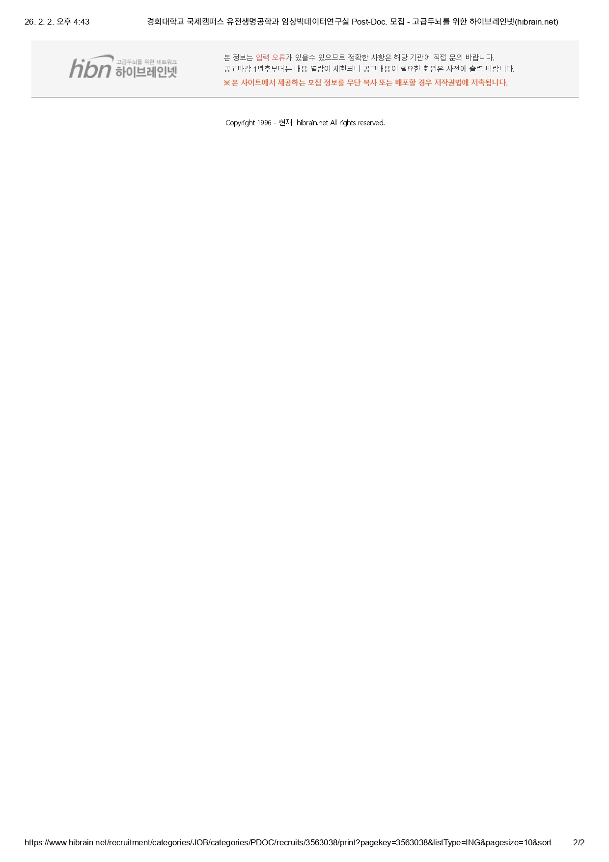 채용정보는 공고 마감 1년 후 부터는 열람이 제한되니 공고내용이 필요한 회원은 사전에 출력 바랍니다.