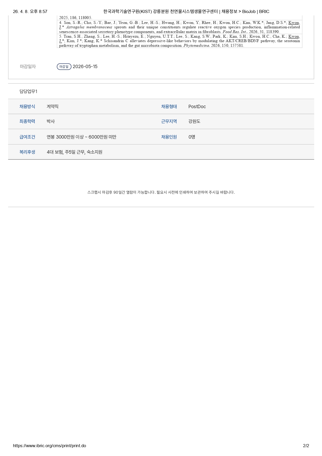 한국과학기술연구원 강릉분원 천연물연구소 Post-Doc. 모집