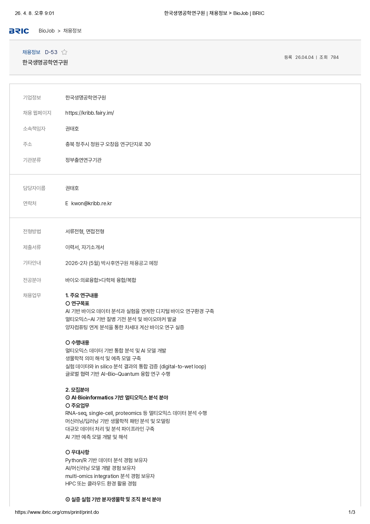 한국생명공학연구원 Post-Doc. 모집