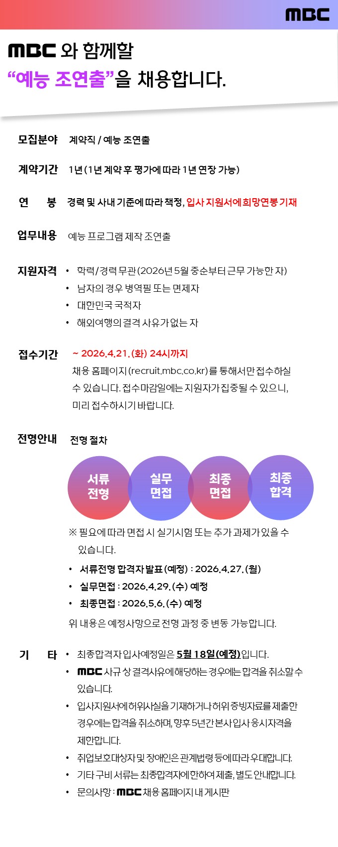 | 예능본부 예능 조연출 | 연극·영화·방송 (방송기술 포함) | 전문학사 이하 | - |