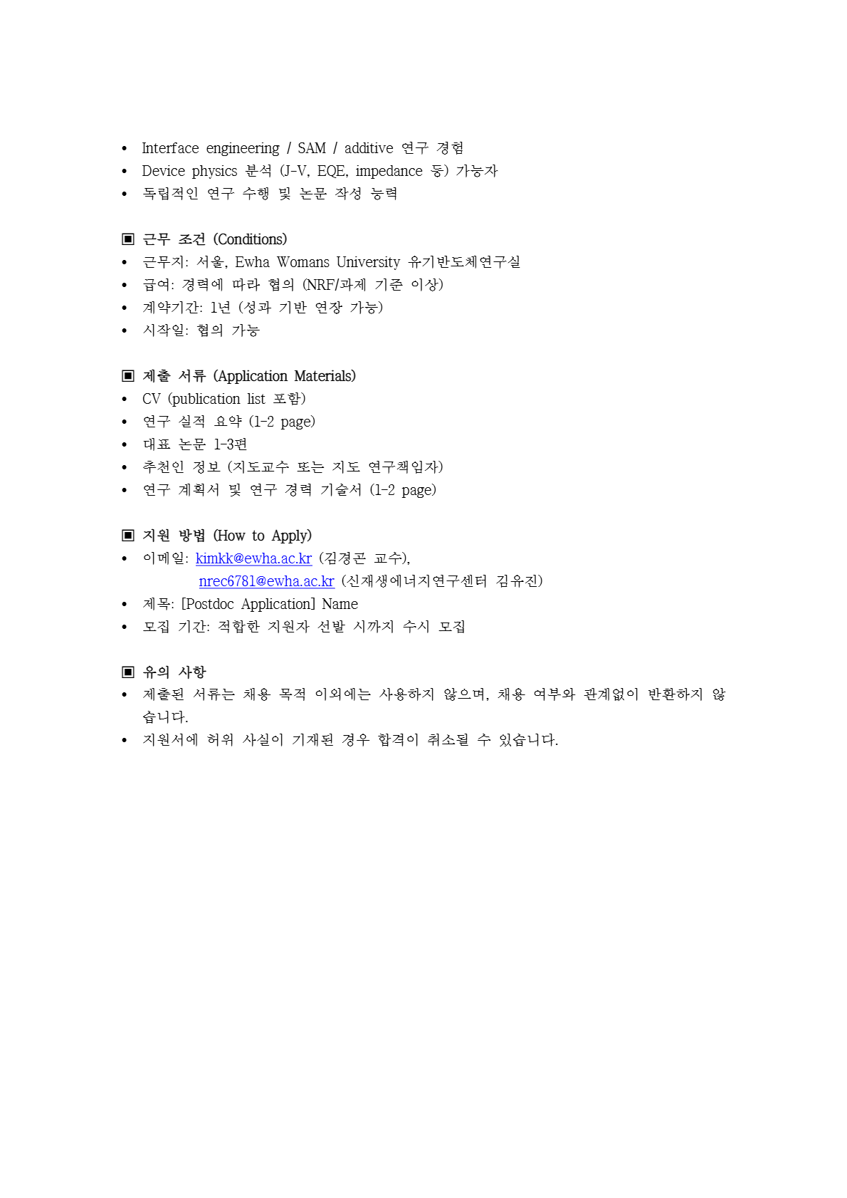 이화여자대학교 화학나노과학과 유기반도체연구실 Post-Doc. 모집