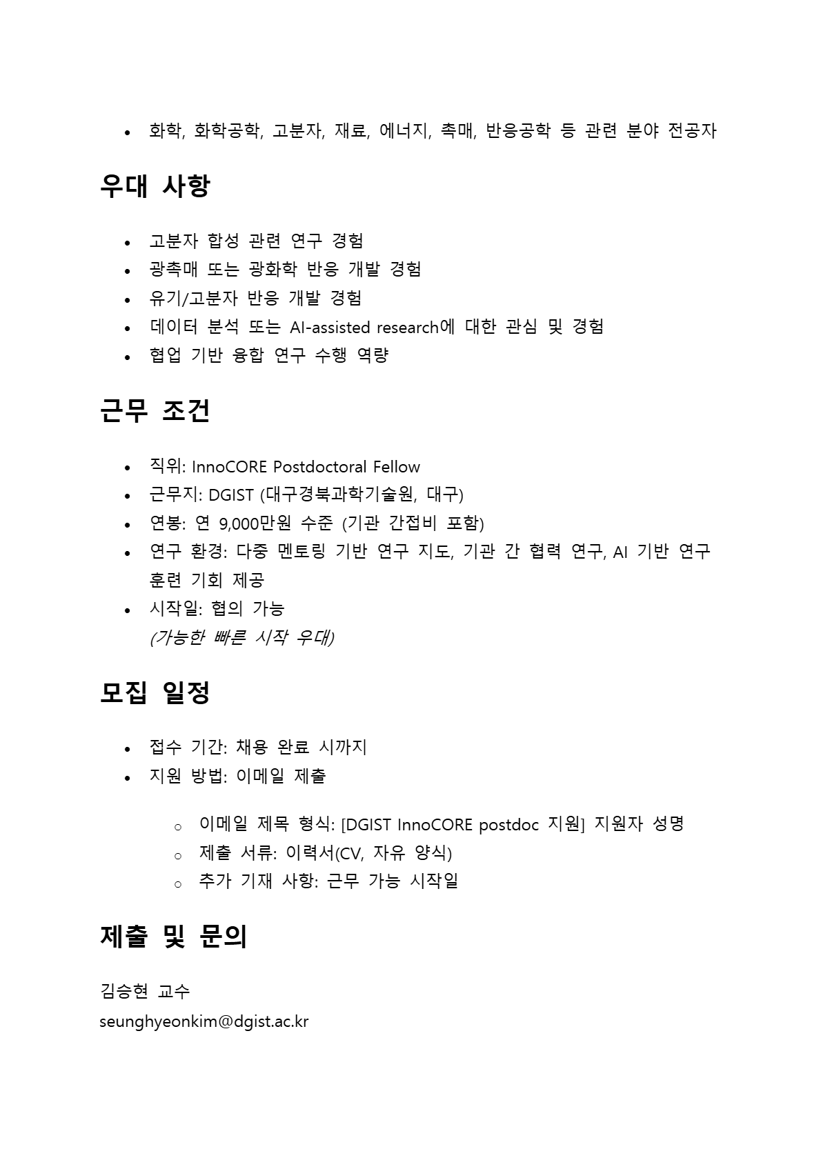 DGIST 에너지공학과 고분자광촉매연구실 InnoCORE Post-Doc. 모집