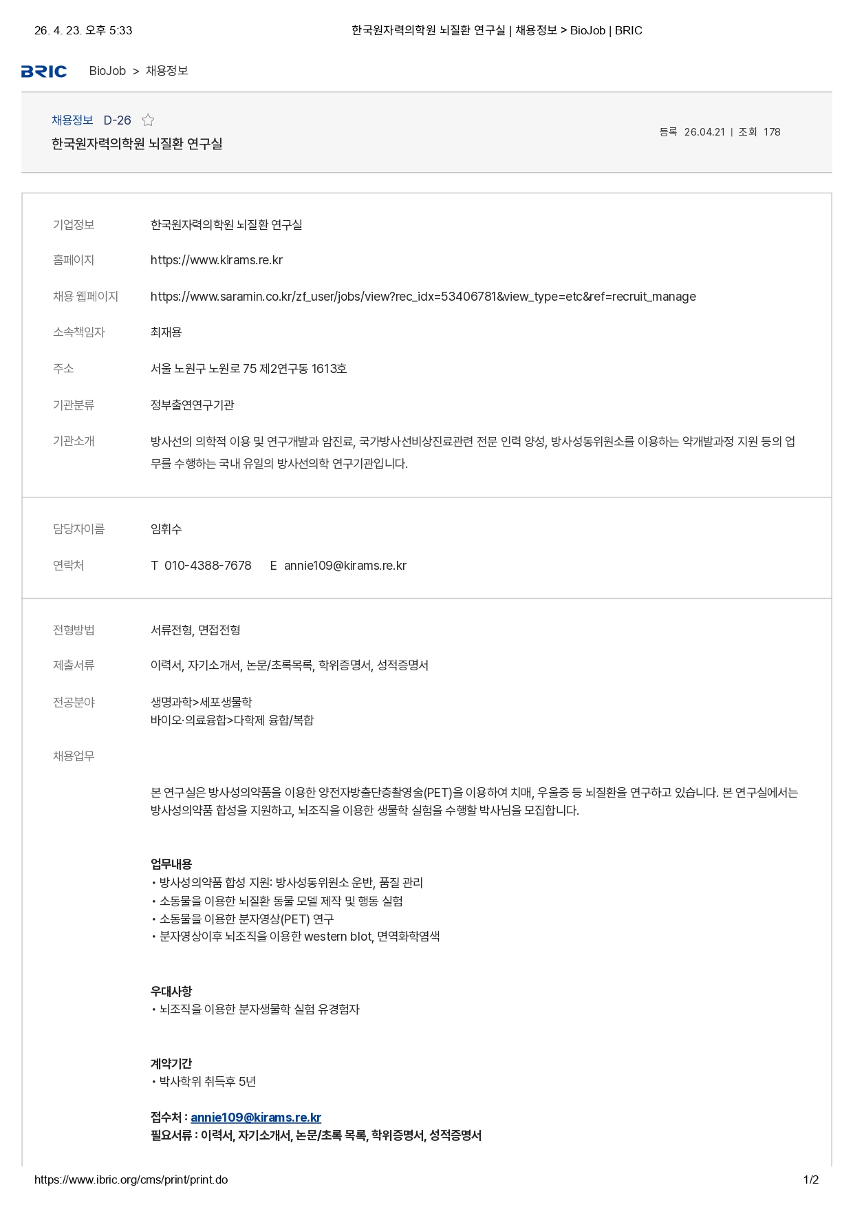 한국원자력의학원 뇌질환연구실 Post-Doc. 모집
