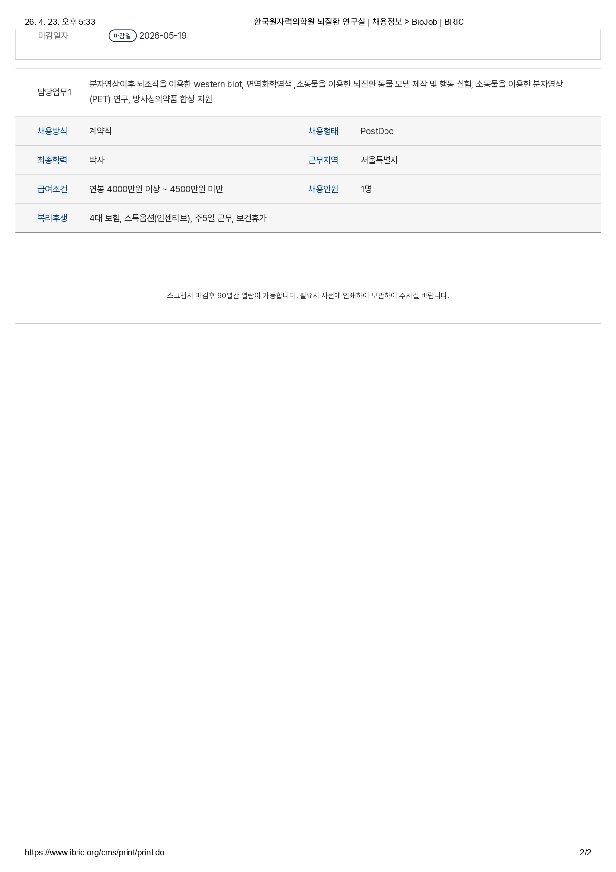 채용정보는 공고 마감 1년 후 부터는 열람이 제한되니 공고내용이 필요한 회원은 사전에 출력 바랍니다.