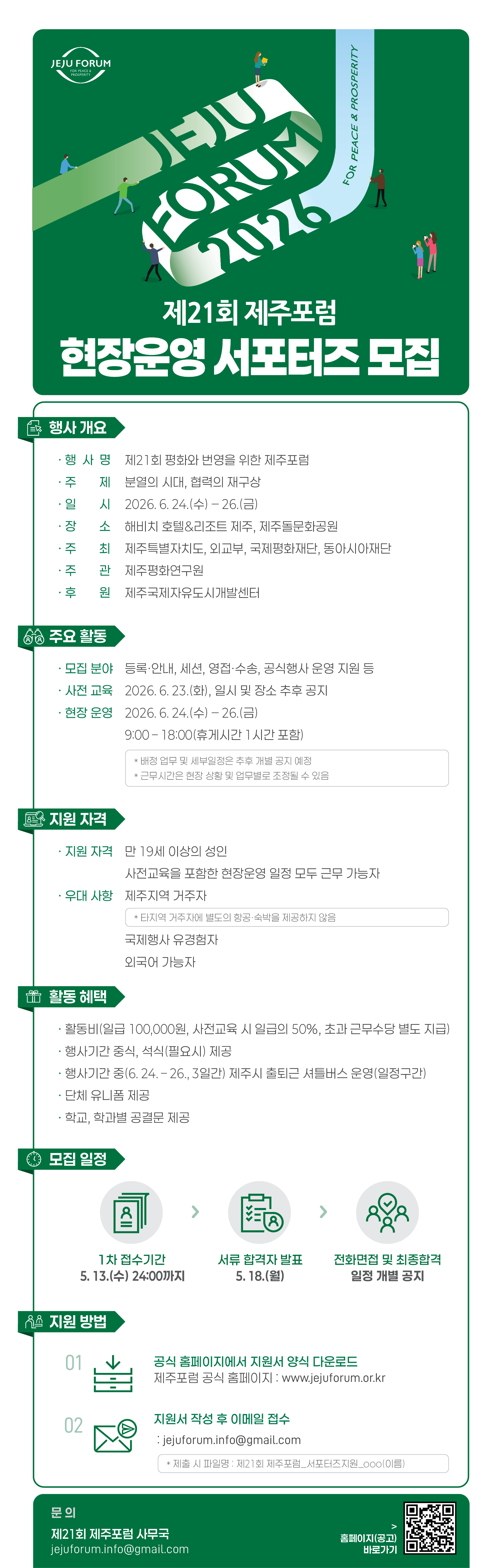 | 대외/봉사활동 | - 1) 만 19세 이상의 성인 - 2) 사전교육을 포함한 현장운영 일정 모두 근무 가능자 [우대 사항] - 1) 제주지역 거주자 (*타지역 거주자에 별도의 항공∙숙박을 제공하지 않음) - 2) 국제행사 유경험자 - 3) 외국어 가능자 |