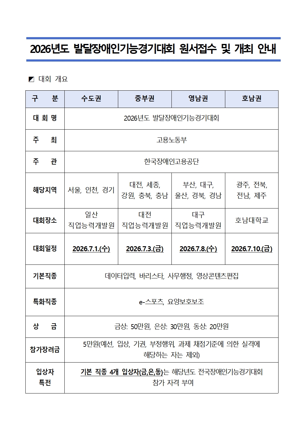 | 대외/봉사활동 | ❍ 만 15세 이상의 지적·자폐성장애인(대회 개최일 기준) ※ 장애인: 「장애인고용촉진 및 직업재활법」 제2조제1호 및 동법 시행령 제3조에 의함 ※ 중복장애의 경우, 지적·자폐성 장애가 포함되면 참가 가능 ❍ 참가 희망 직종의 전국·국제대회 입상 경험이 없는자 ※ 단, 입상 직종과 다른 직종으로는 참가 가능 ❍ 같은 연도의 지방대회, 전국대회만 시행되는 직종에 동시 참가 불가 ❍ 학력제한 없음 |