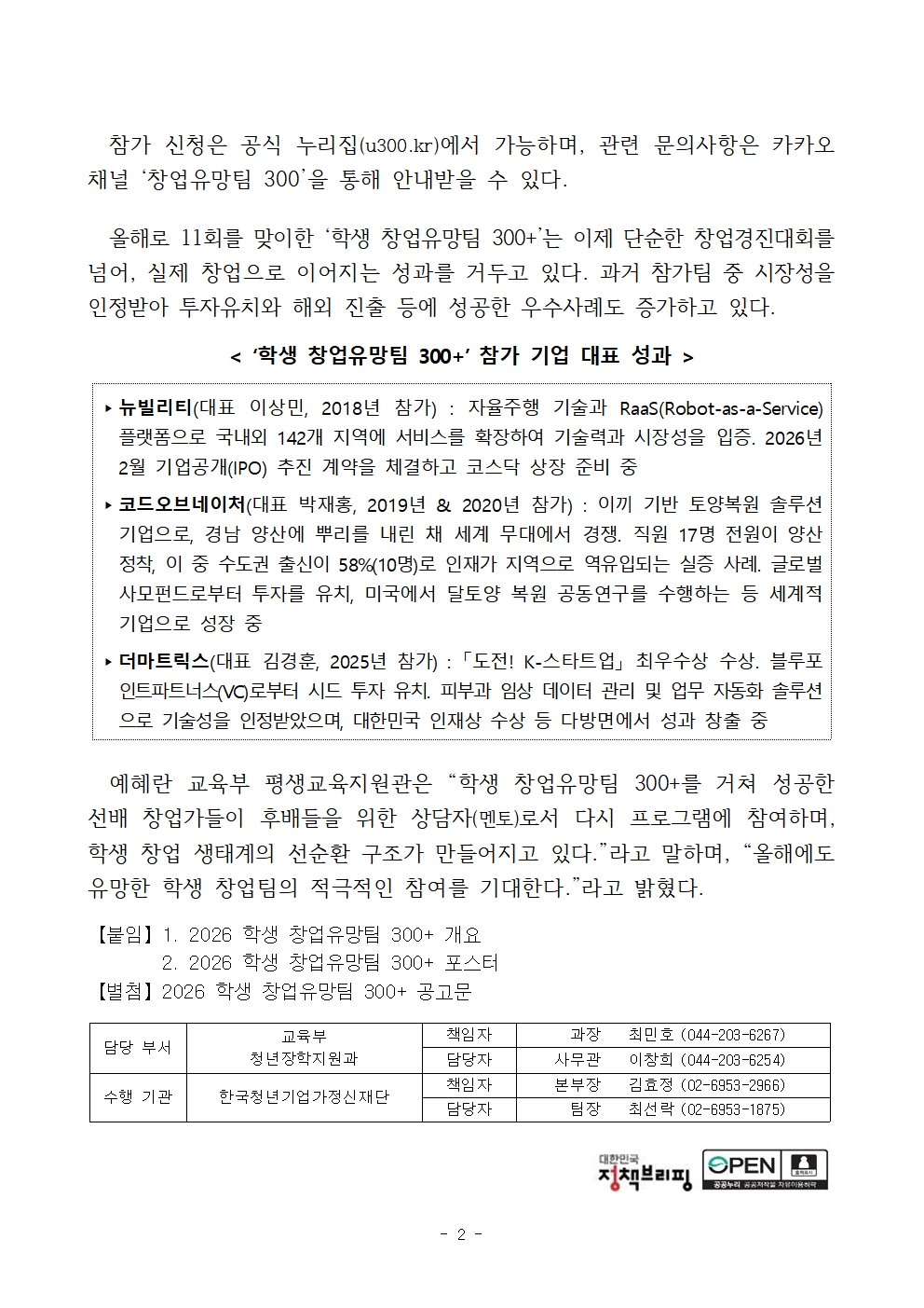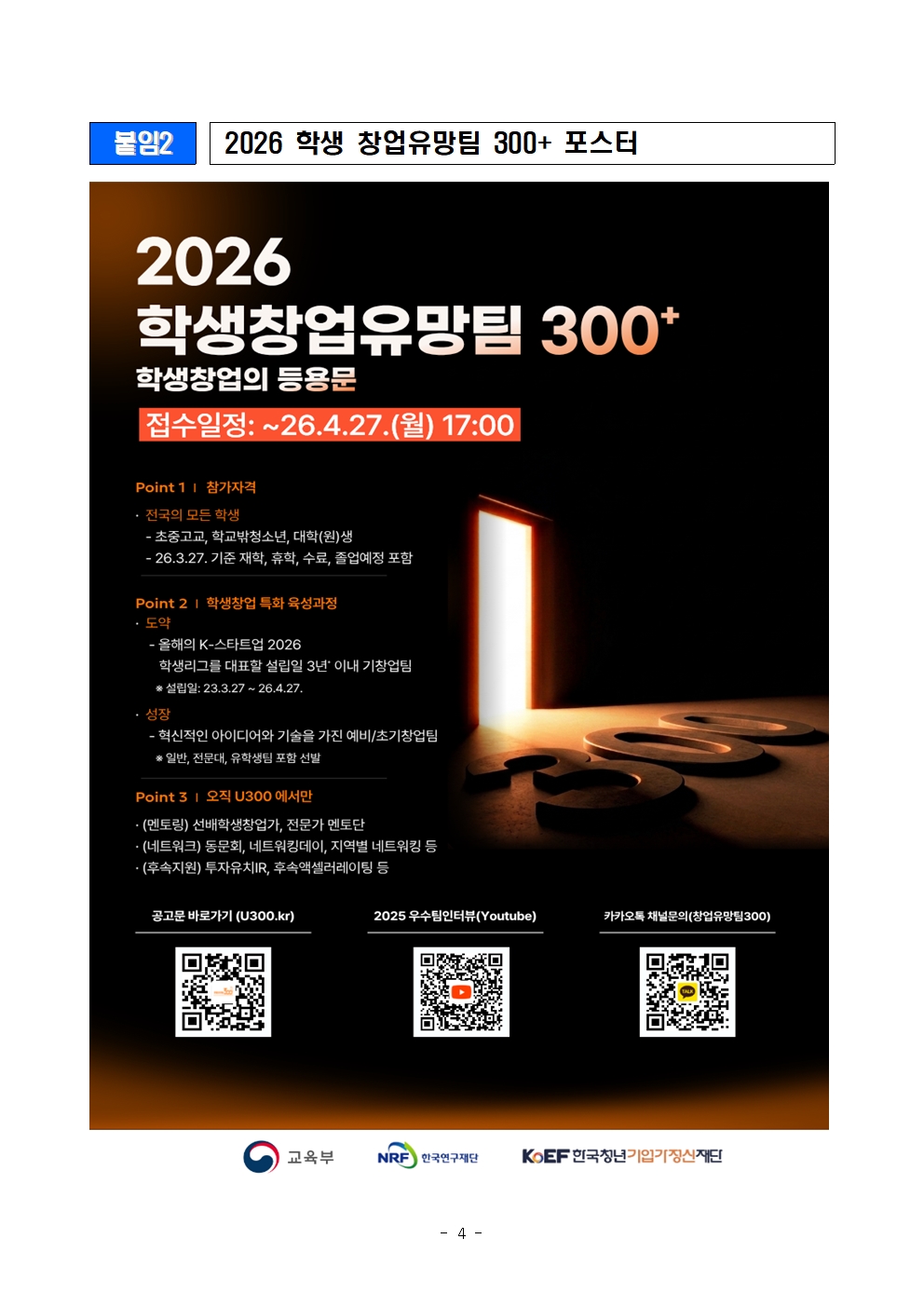 [교육부 / 한국연구재단,한국청년기업가정신재단] 2026 학생 창업유망팀 300+