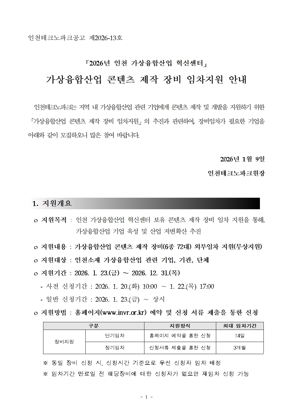 [인천] 2026년 가상융합산업 콘텐츠 제작 장비 임차지원 공고(인천 가상융합산업 혁신센터)