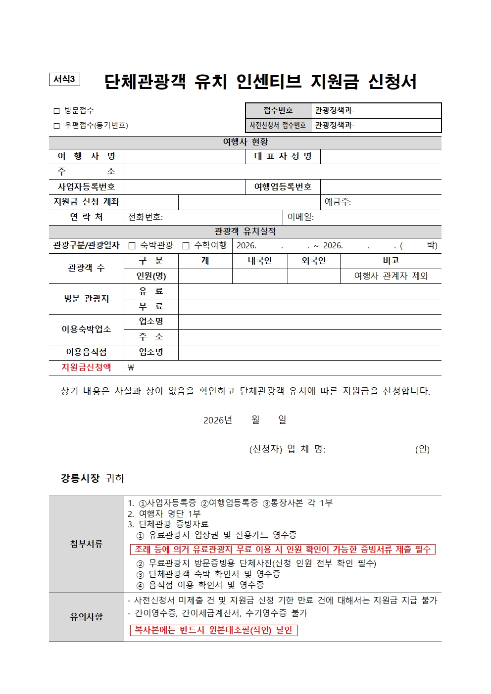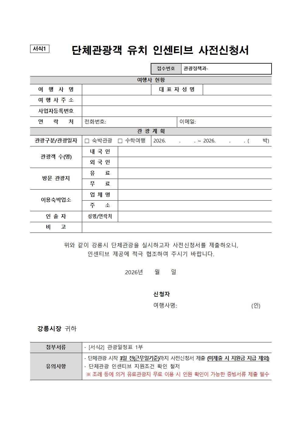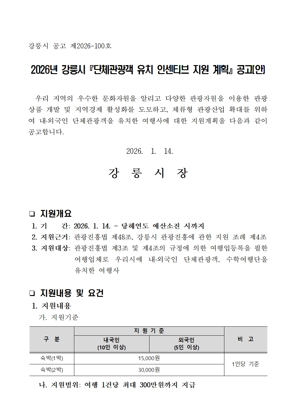 2026년 강릉시 단체관광객 유치 인센티브 지원계획 공고