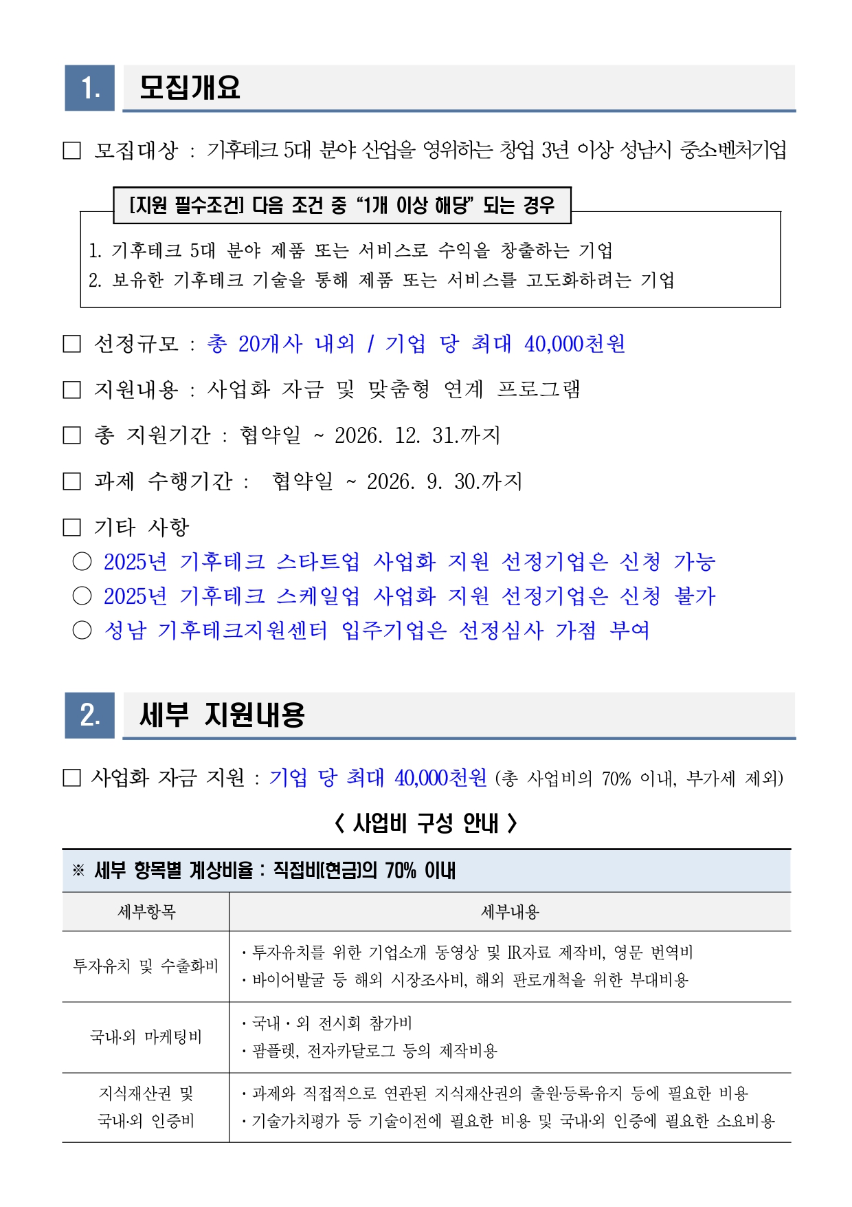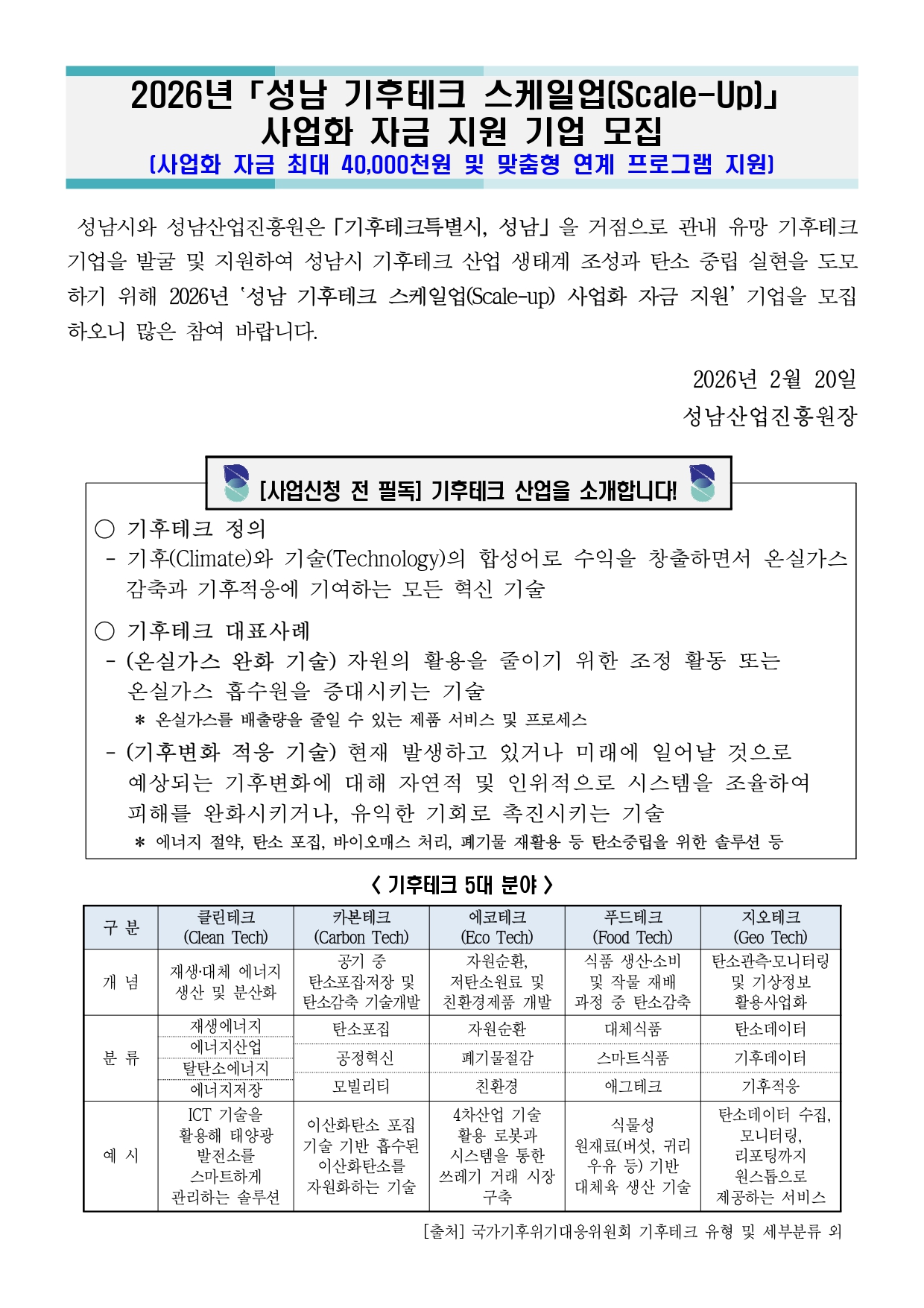 경영 [경기] 성남시 2026년 기후테크 스케일업(Scale-Up) 사업화 자금 지원기업 모집 공고