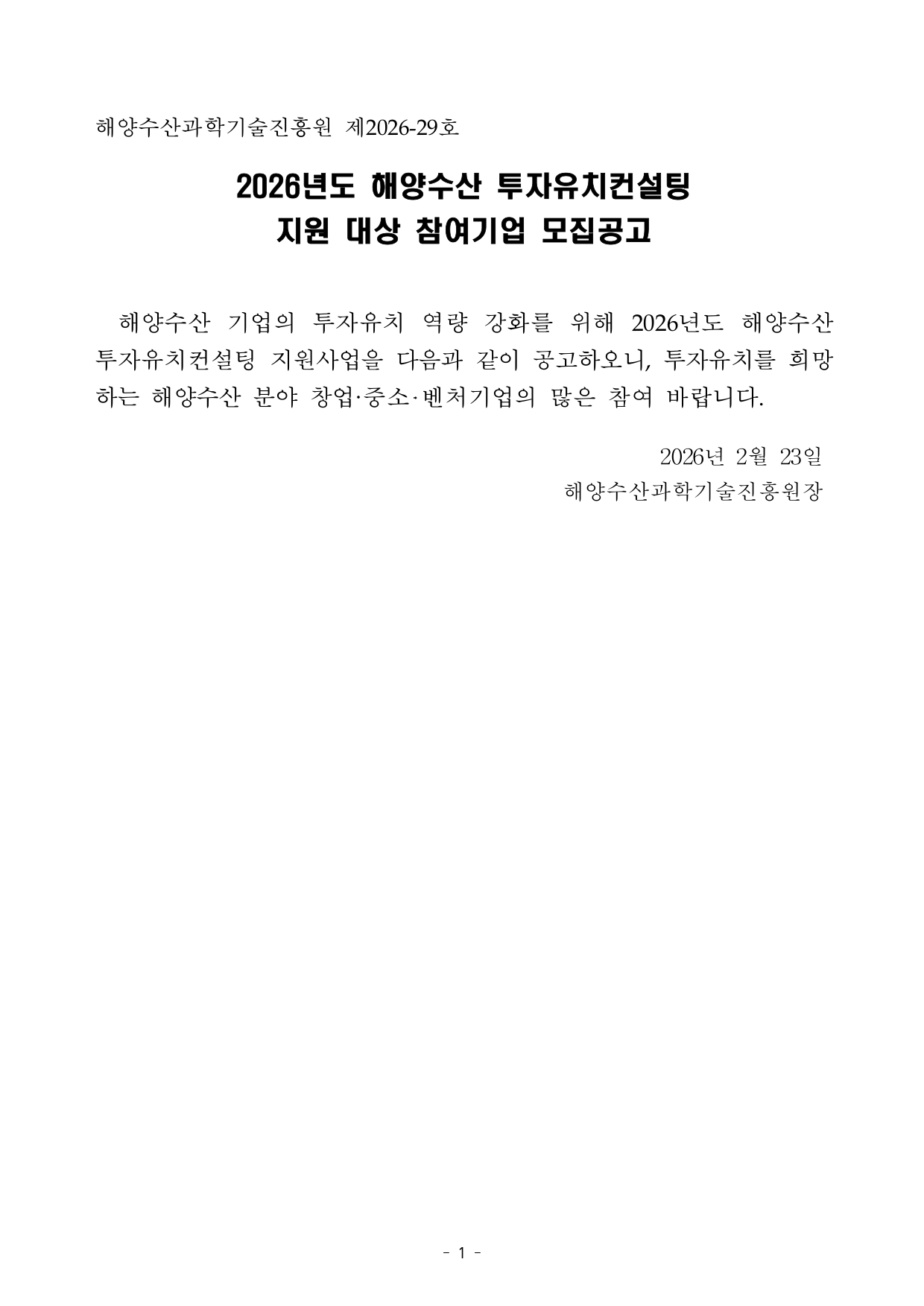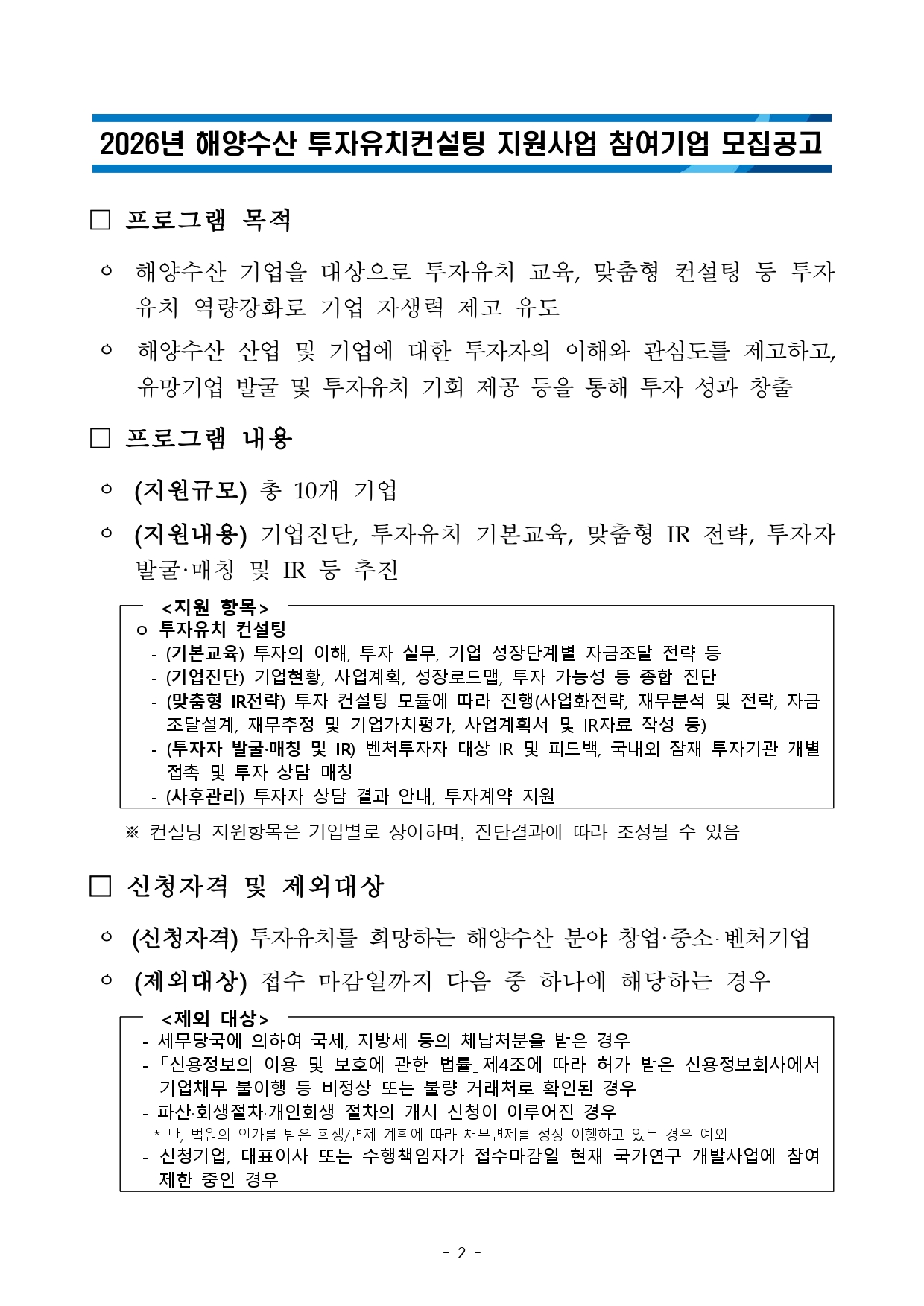 2026년 해양수산 투자유치컨설팅 지원 대상 참여기업 모집 공고