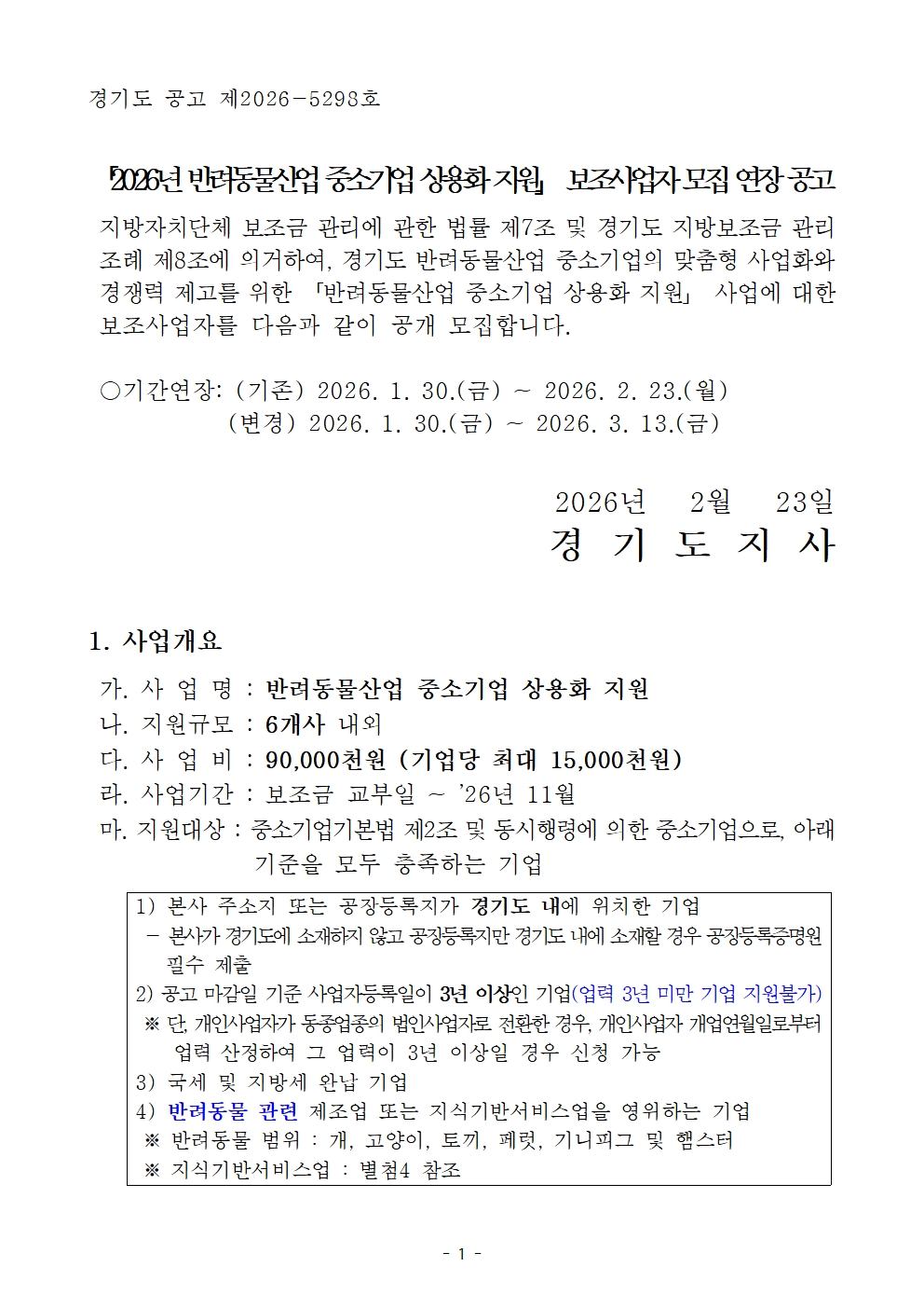 [경기] 2026년 반려동물산업 중소기업 상용화 지원 보조사업자 모집 연장 공고