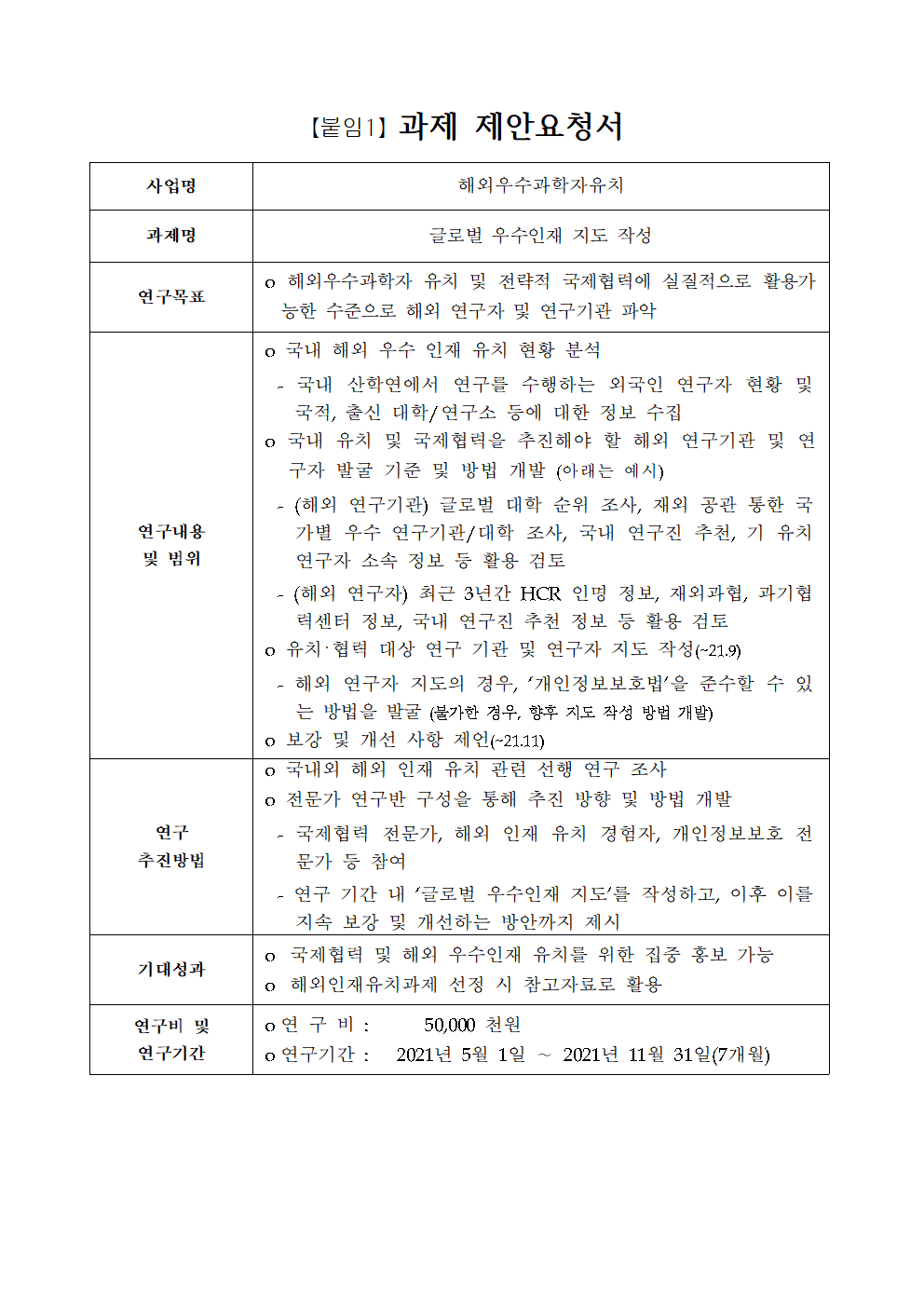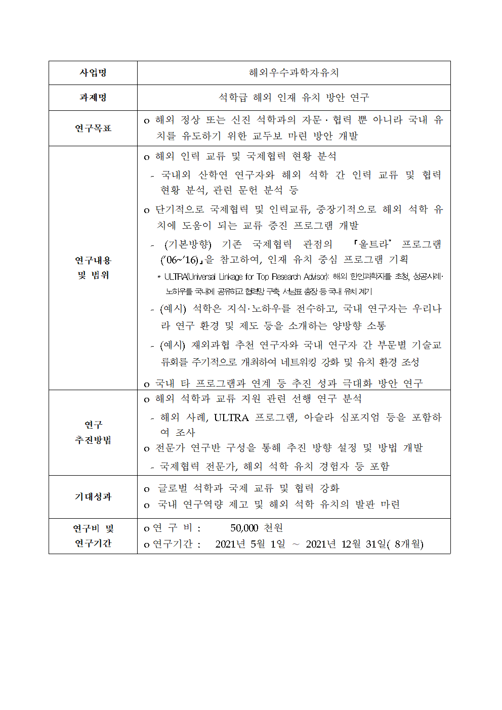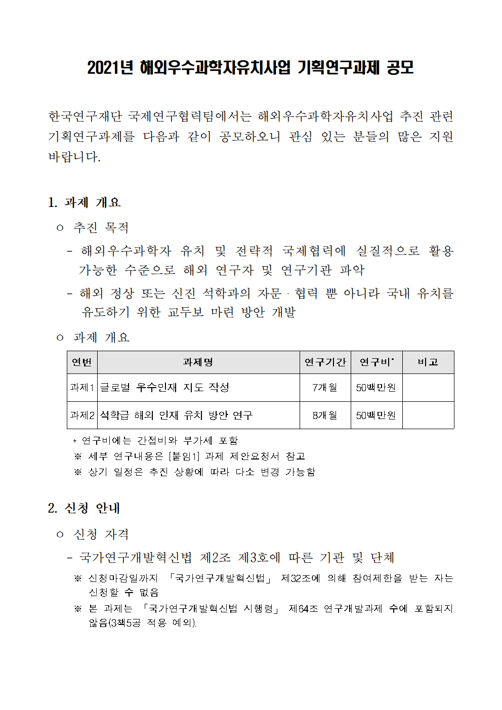 2021년 해외우수과학자유치사업 기획연구과제 공모