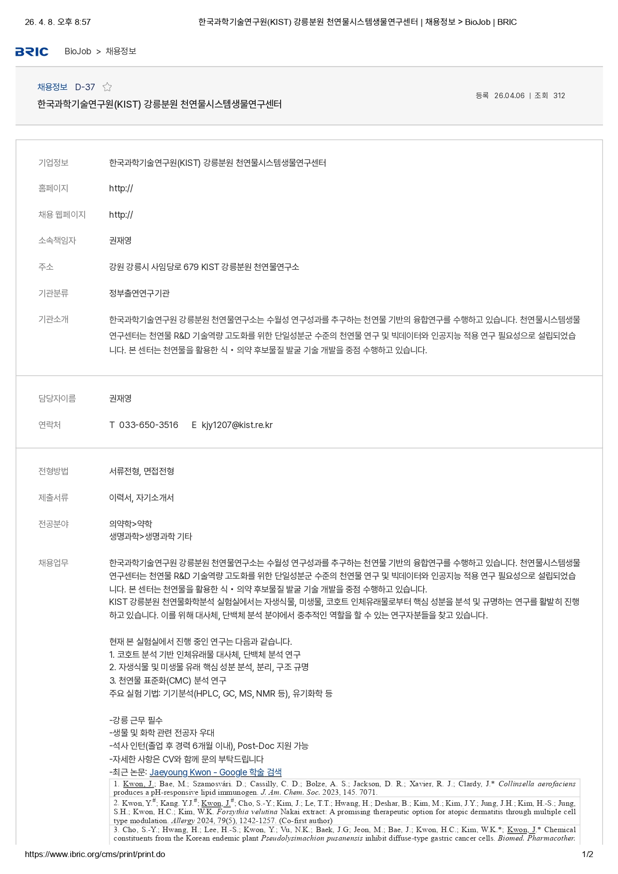 한국과학기술연구원 강릉분원 천연물연구소 Post-Doc. 모집