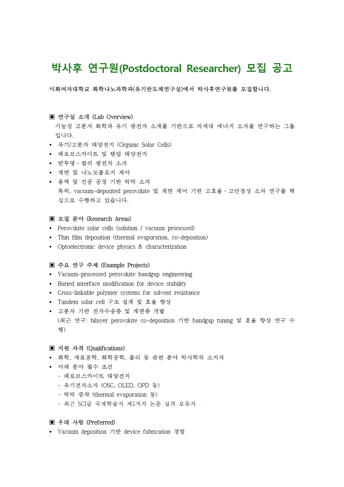 이화여자대학교 화학나노과학과 유기반도체연구실 Post-Doc. 모집