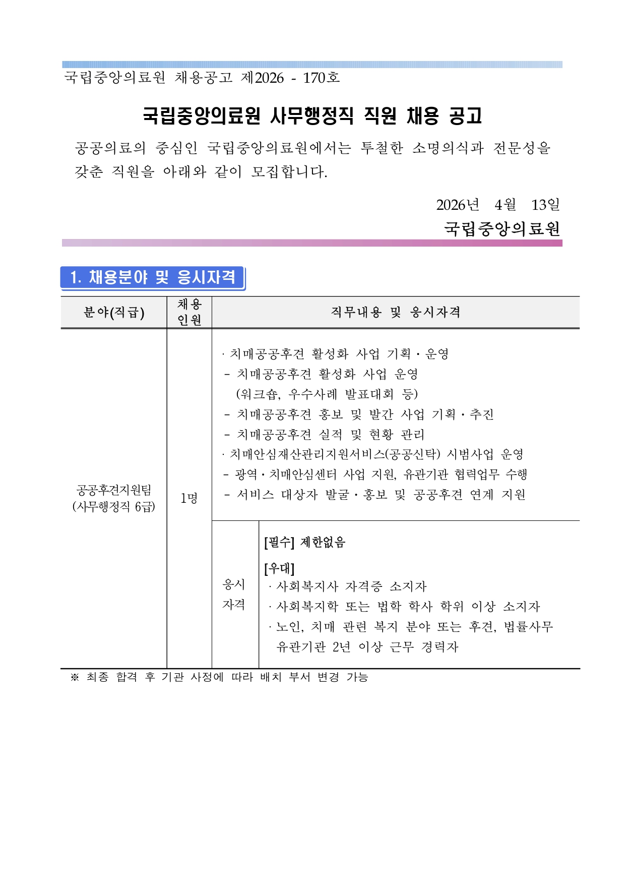 | -사무행정직 6급(공공후견지원팀) | - <부문별 세부사항 공고 참조> | - <부문별 세부사항 공고 참조> | 0명 |