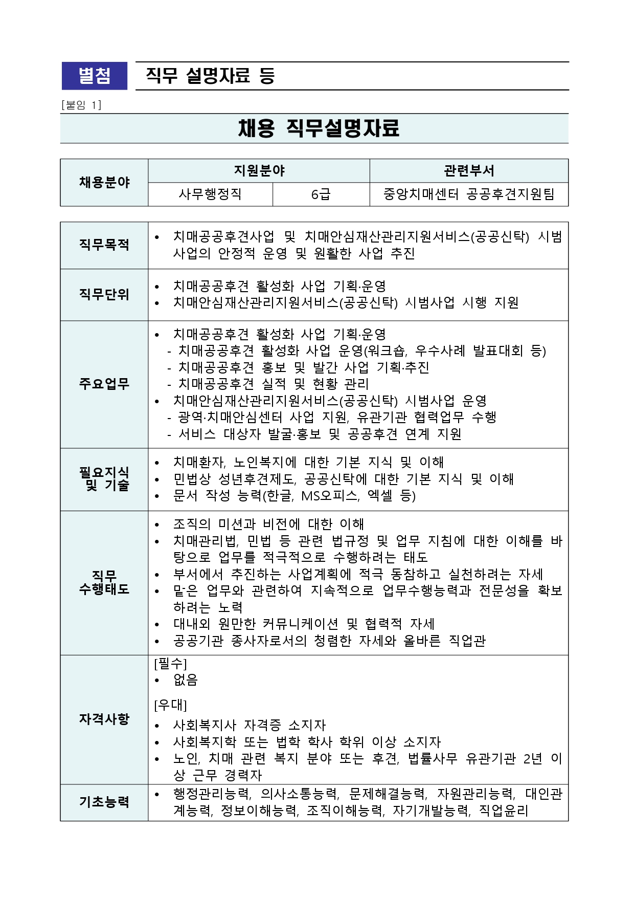 사무행정직 6급(공공후견지원팀) 채용 공고