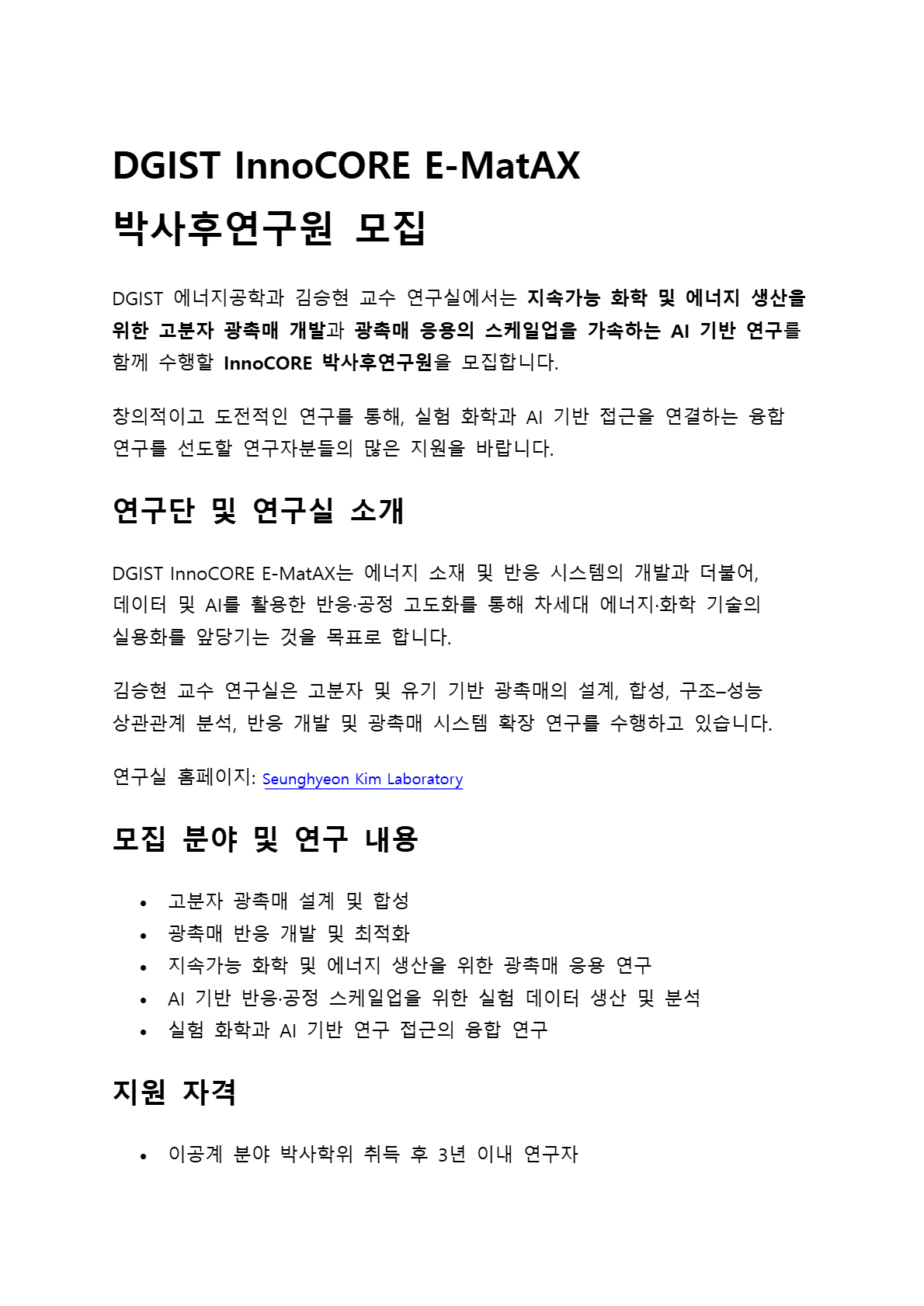 DGIST 에너지공학과 고분자광촉매연구실 InnoCORE Post-Doc. 모집