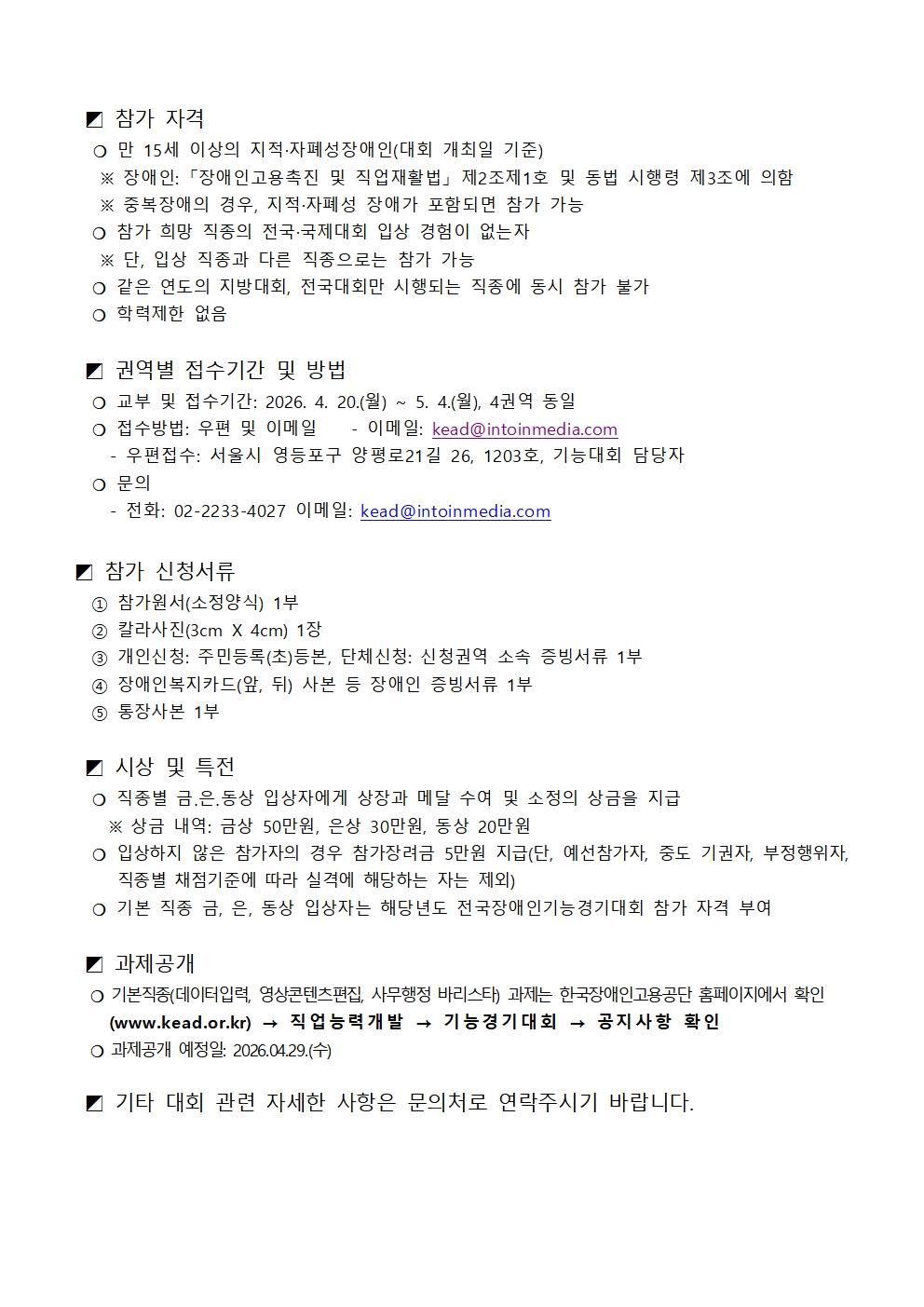 | 대외/봉사활동 | ❍ 만 15세 이상의 지적·자폐성장애인(대회 개최일 기준) ※ 장애인: 「장애인고용촉진 및 직업재활법」 제2조제1호 및 동법 시행령 제3조에 의함 ※ 중복장애의 경우, 지적·자폐성 장애가 포함되면 참가 가능 ❍ 참가 희망 직종의 전국·국제대회 입상 경험이 없는자 ※ 단, 입상 직종과 다른 직종으로는 참가 가능 ❍ 같은 연도의 지방대회, 전국대회만 시행되는 직종에 동시 참가 불가 ❍ 학력제한 없음 |